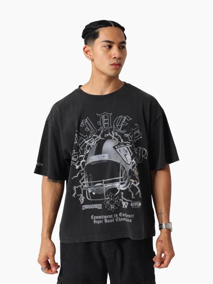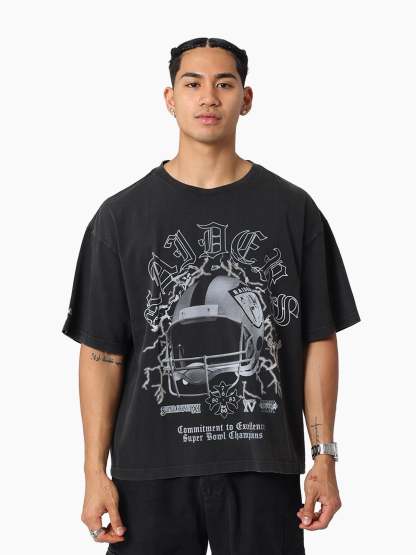 Celebrate the legacy of the Silver and Black with the Oakland Raiders Excellence Tee. Featuring a boxy fit and pigment dye with a heavy enzyme wash for that vintage edge, this tee stands out with custom digital print graphics of the iconic Raiders helmet. Finished with the embroidered Mitchell & Ness logo on the right sleeve — a true mark of gridiron greatness. The Oakland Raiders were founded & played from 1960-1981 before relocating to Los Angeles. The Raiders played in L.A from '82-'94, before shifting home to Oakland in '95. They remained in Oakland until 2019 before moving to their current home in Las Vegas. The iconic logo of a pirate or 'raider' wearing a helmet has been stood as the team logo & colours since 1964.
