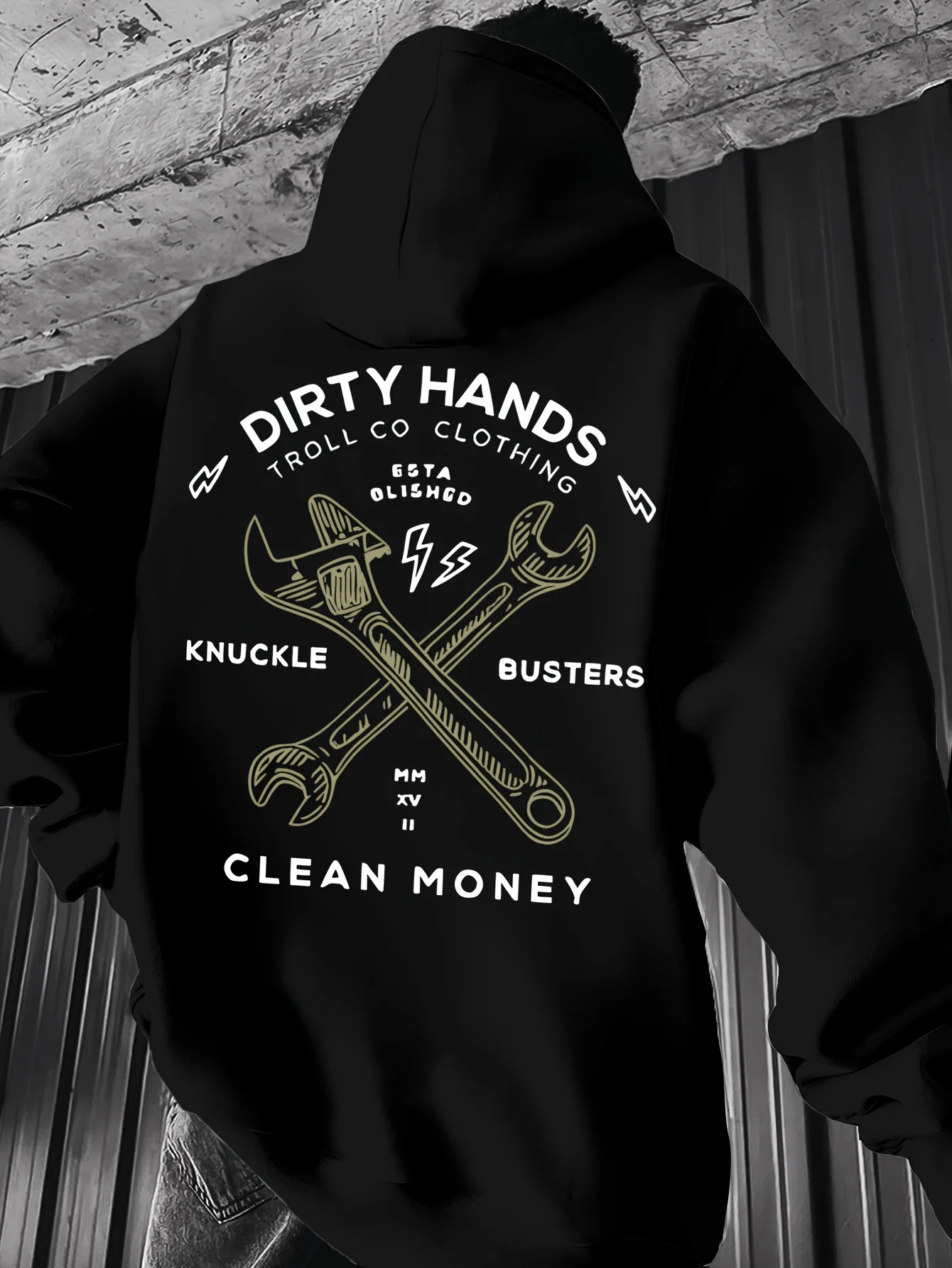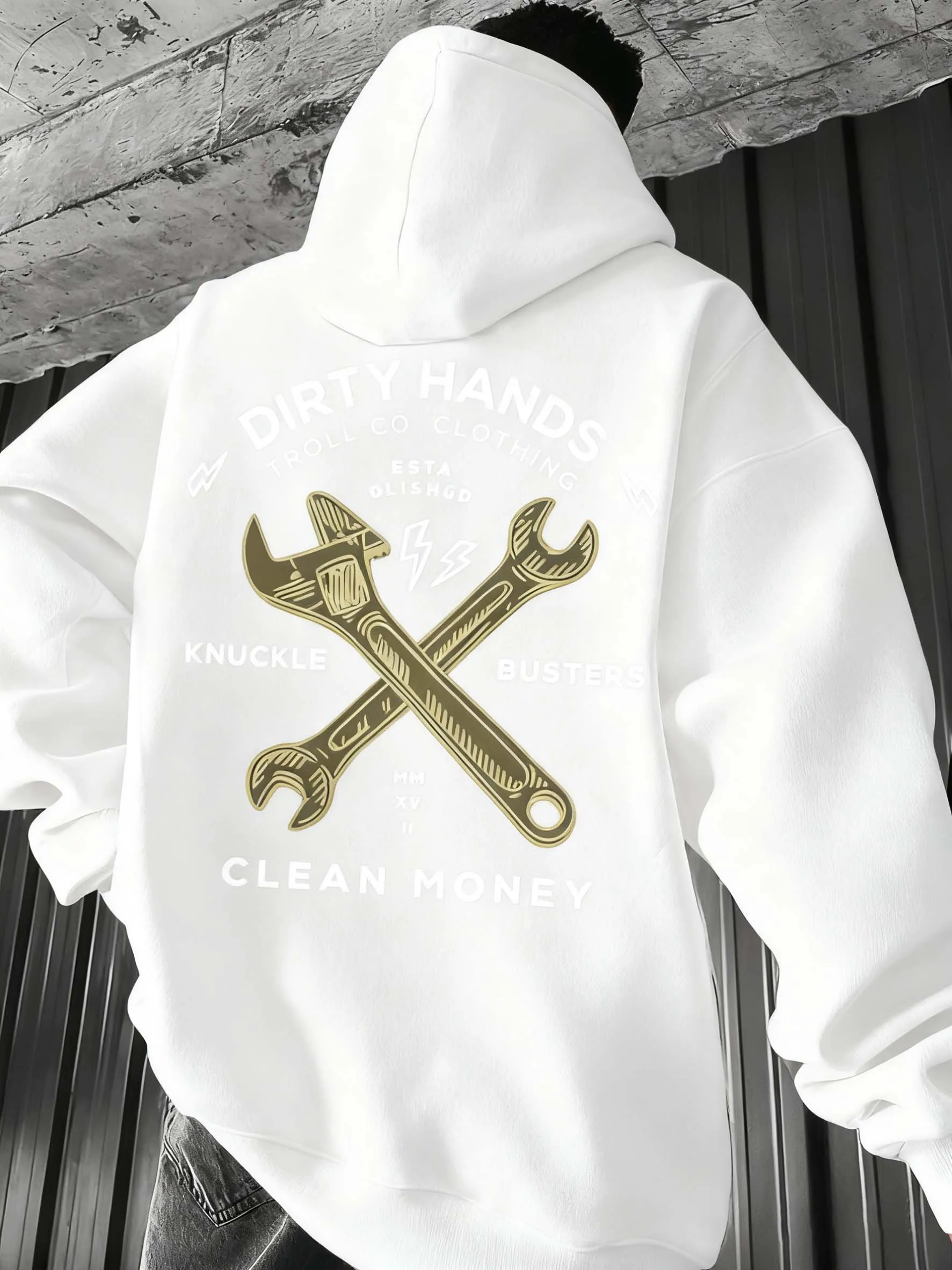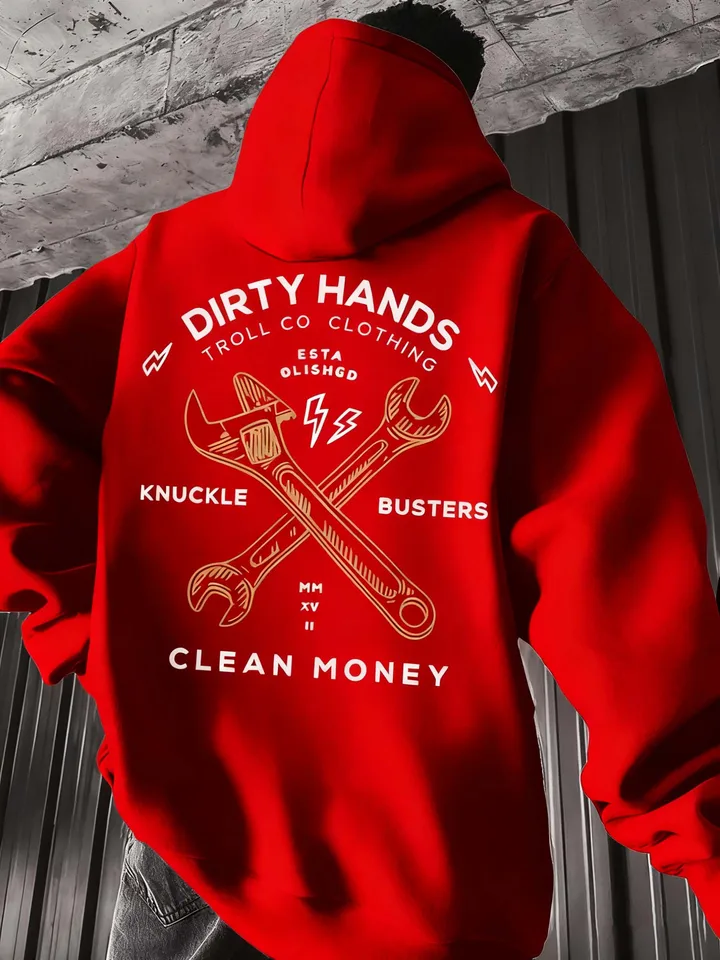 Men's heavy-duty mechanic hoodie with wrench and hammer patterns printed on it