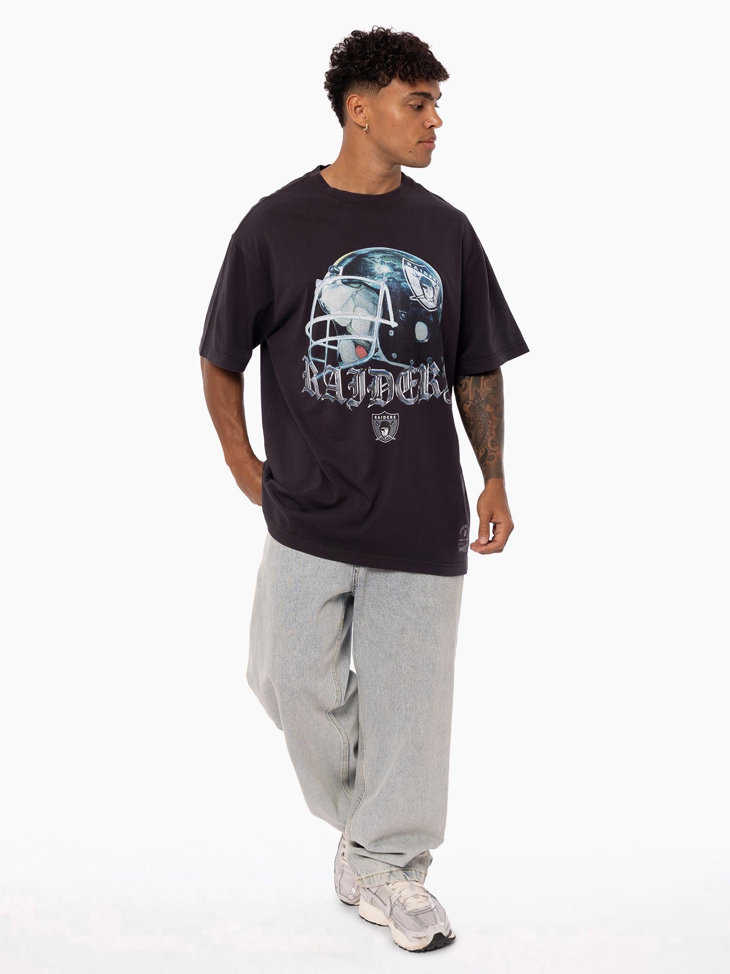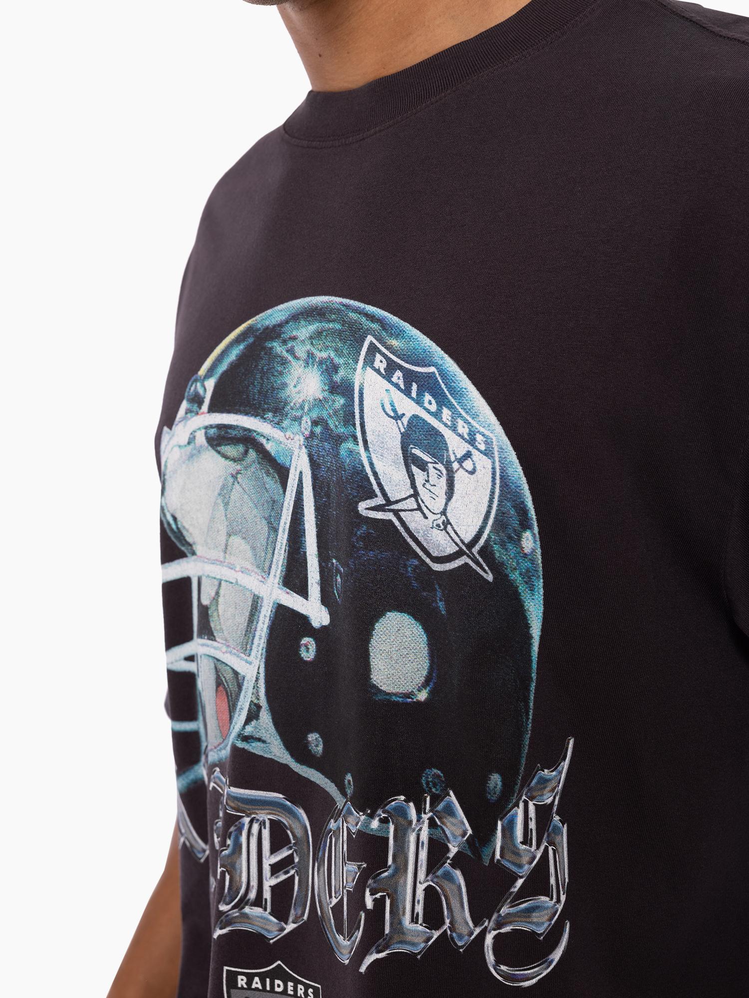 Rep the Silver and Black in the Raiders Helmet Tee — a bold nod to gridiron glory. Featuring a striking oversized helmet graphic with vintage-style digital print, this tee brings serious attitude. Made from premium cotton and enzyme-washed for that lived-in feel, it’s finished with a jock tag print and overdyed black for that true throwback edge. The Raiders NFL franchise has played between Oakland and Los Angeles since 1960 before relocating to Las Vegas in January '20. The iconic logo of a pirate or 'raider' wearing a helmet has been stood as the team logo & colours since 1964.