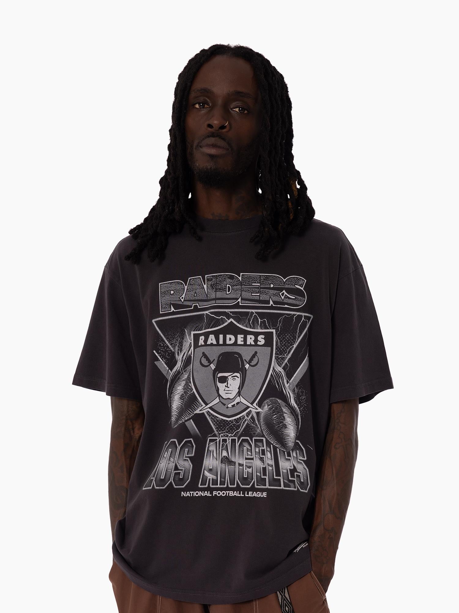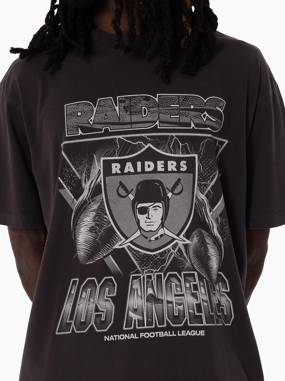 Unleash your street style with the new Los Angeles Raiders Trigon Tee. Featuring bold screen printed graphics, an enzyme wash, and distressed detailing for a vintage vibe. Finished with a printed jocktag, this tee strikes the perfect balance between retro style and Raiders pride. The Raiders NFL franchise has played between Oakland and Los Angeles since 1960 before relocating to Las Vegas in January '20. The iconic logo of a pirate or 'raider' wearing a helmet has been stood as the team logo & colours since 1964.