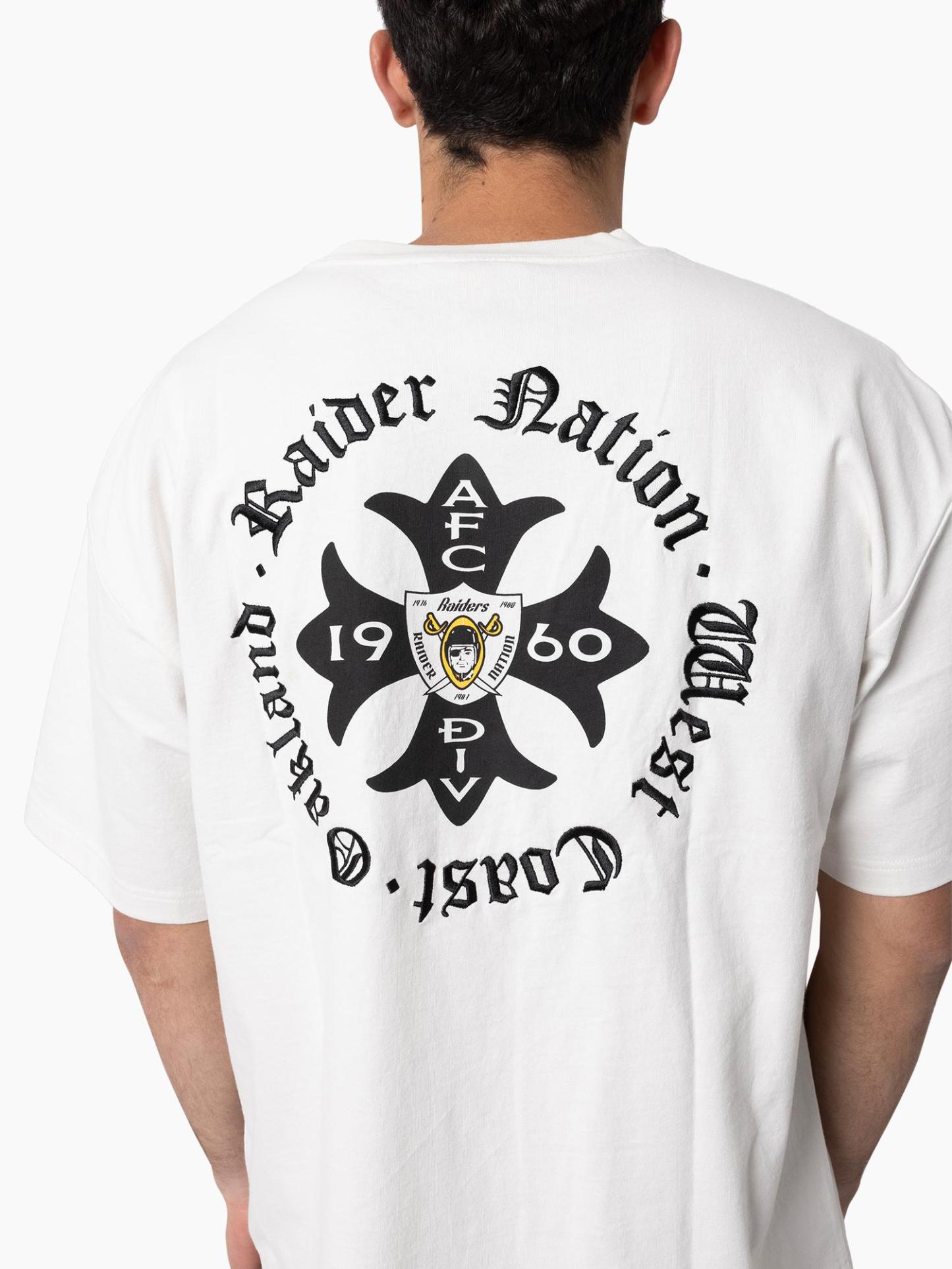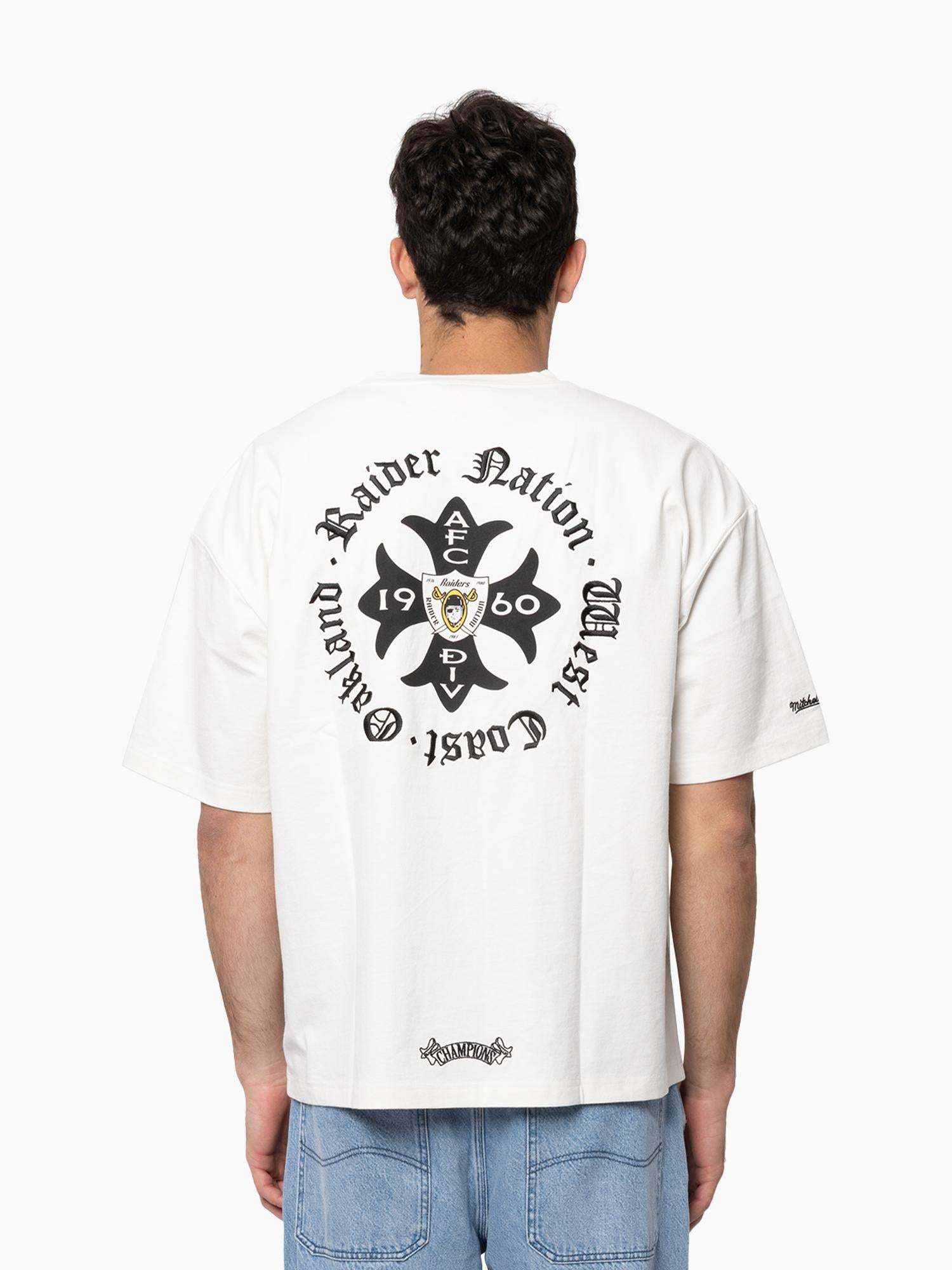 Show your allegiance to the Silver and Black with the Oakland Raiders Raider Nation Tee. Crafted from 100% cotton in a boxy fit, this white tee features a pigment dye and heavy enzyme wash for a true vintage feel. Embroidered and printed logos on the front and back bring bold team energy, finished with the iconic Mitchell & Ness logo on the right sleeve. The Oakland Raiders were founded & played from 1960-1981 before relocating to Los Angeles. The Raiders played in L.A from '82-'94, before shifting home to Oakland in '95. They remained in Oakland until 2019 before moving to their current home in Las Vegas. The iconic logo of a pirate or 'raider' wearing a helmet has been stood as the team logo & colours since 1964.